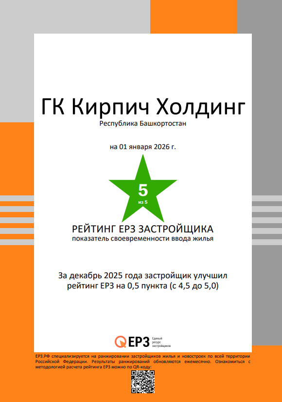 По данным портала ЕРЗ.РФ на 01.01.2026 г. ГК Кирпич Холдинг присвоен наивысший рейтинг — ★ 5,0 баллов по показателю своевременности ввода жилья. За декабрь 2025 года застройщик улучшил рейтинг ЕРЗ на 0,5 пункта (с 4,5 до 5,0).