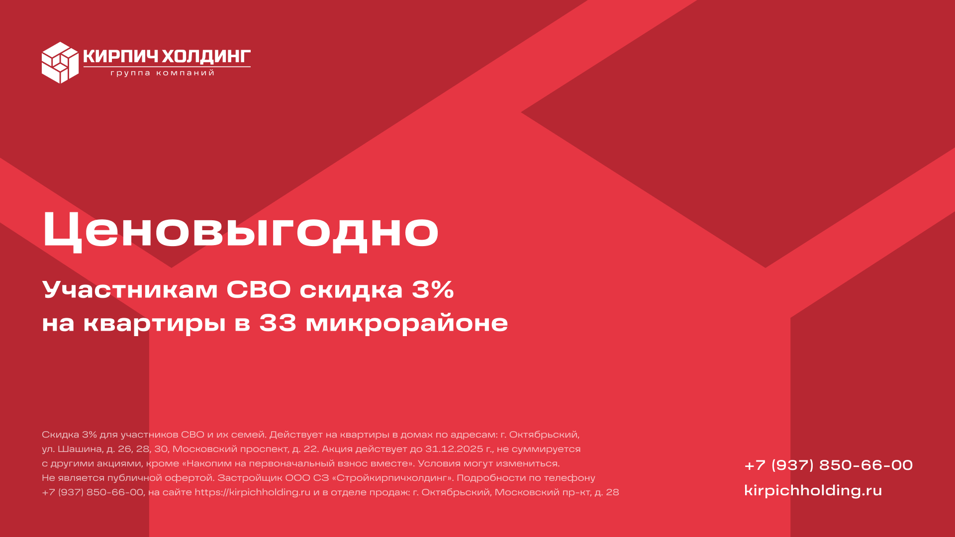 Скидка 3% участникам СВО и членам их семей. Акция действует на дома, расположенные по адресам: г. Октябрьский ул. Шашина, д. 26, 28, 30, Московский проспект д. 22. Акция не суммируются с другими акциями застройщика кроме «накопим на первоначальный взнос вместе». Не является публичной офертой и могут быть изменены. Подробности по телефону +79378506600 или в отделе продаж по адресу: г. Октябрьский, Московский проспект, д.28.