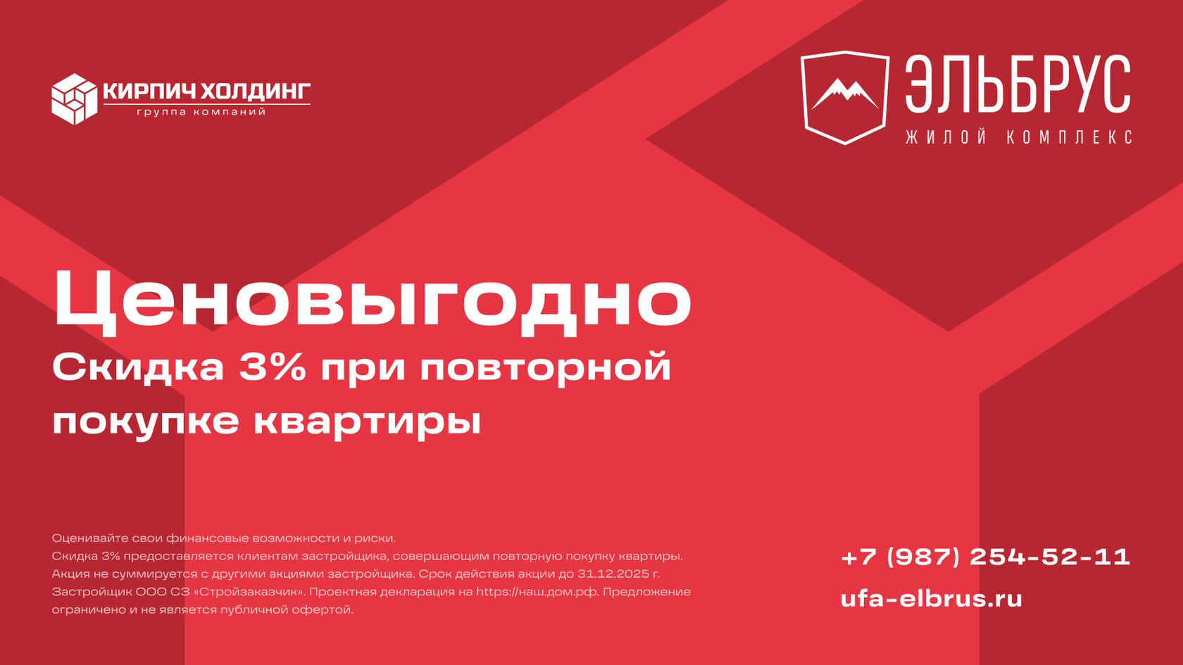 Скидка 3% в ЖК Эльбрус при повторной покупке в ГК КирпичХолдинг. Акция не суммируются с другими акциями застройщика кроме «накопим на первоначальный взнос вместе». Не является публичной офертой и могут быть изменены. Подробности по телефону +79872545211 или в отделе продаж по адресу: г. Уфа, Кавказская, д.24. ООО СЗ «Стройзаказчик».
